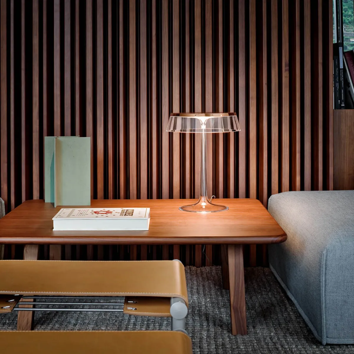 Die Bon Jour ist mehr als eine Tischlampe, sie ist eine Begegnung mit Lichtkultur. Ihre klaren Linien und die schwebend leichte Silhouette verleihen ihr eine fast poetische Anmutung. Der transparente Fuß aus PMMA lässt das Stromkabel elegant durch den Leuchtenkörper scheinen – ein subtiler Designkniff, der die moderne Ästhetik unterstreicht. Bekrönt wird die von einem kupferfarbenen Kopf, der einen Hauch Glamour in den Raum bringt.