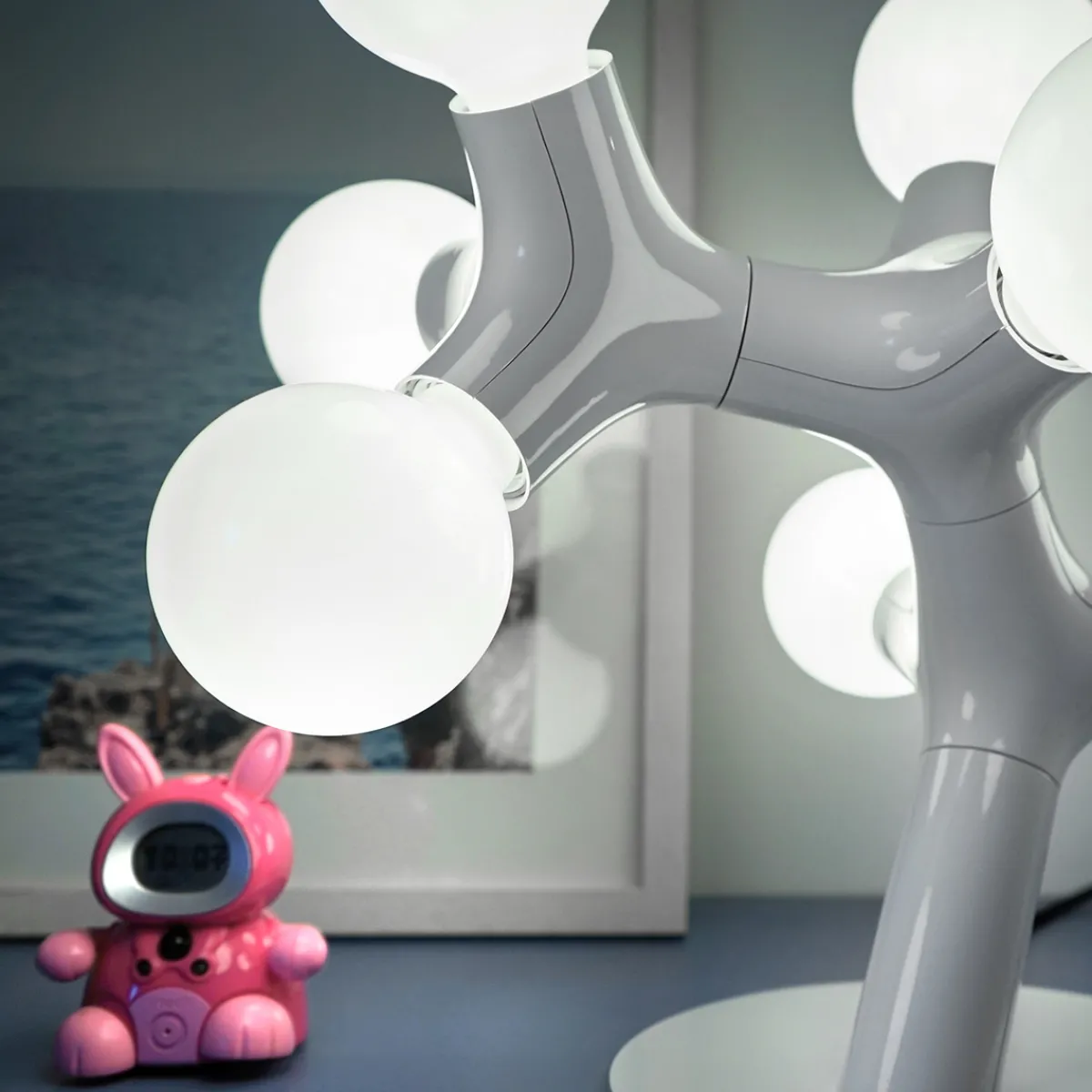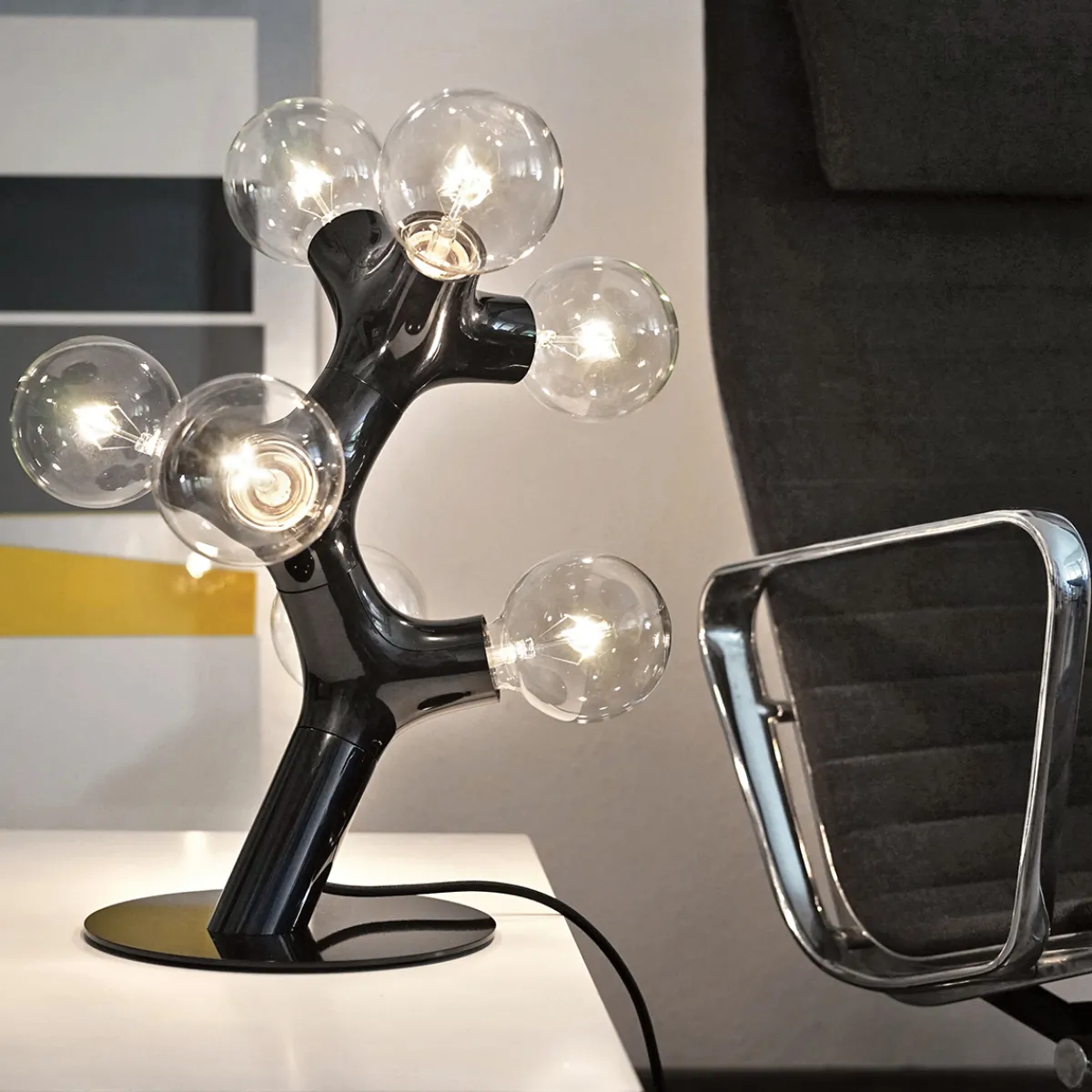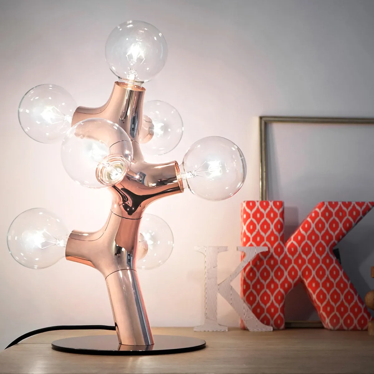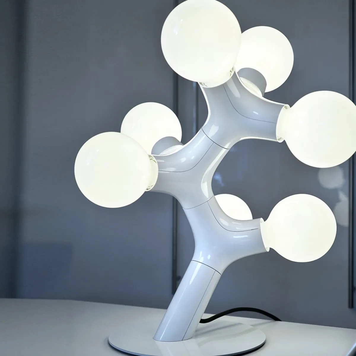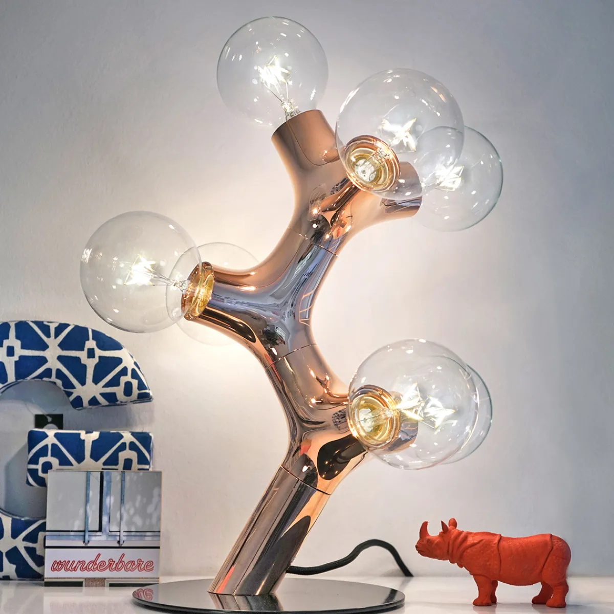 Die originelle Form der DNA Tischleuchte verdankt sich nicht zuletzt den globeförmigen Leuchtmitteln, mit denen die bestückt werden muss. Bitte beachten Sie, dass diese nicht im Lieferumfang inbegriffen sind. Je nach gewünschtem Lichteffekt empfehlen sich opale, klare oder streifenverspiegelte LED-Globelampen.