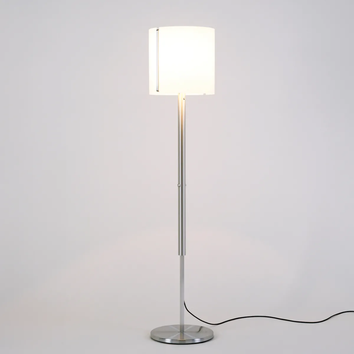 Am Standrohr befinden sich zwei Knöpfe, die leicht gedrückt ein Verstellen der Stehleuchte ermöglichen. Schieben Sie das Rohr nach oben, tritt das Licht über die Oberkante aus und die Jones Floor S wird zum Deckenfluter. In der mittleren Position strahlt das diffus durch den Schirm und gibt ein farbiges Licht ab. Verschieben Sie das Rohr nach unten, entlässt die ihr Licht nach unten sowie seitlich gestreut.