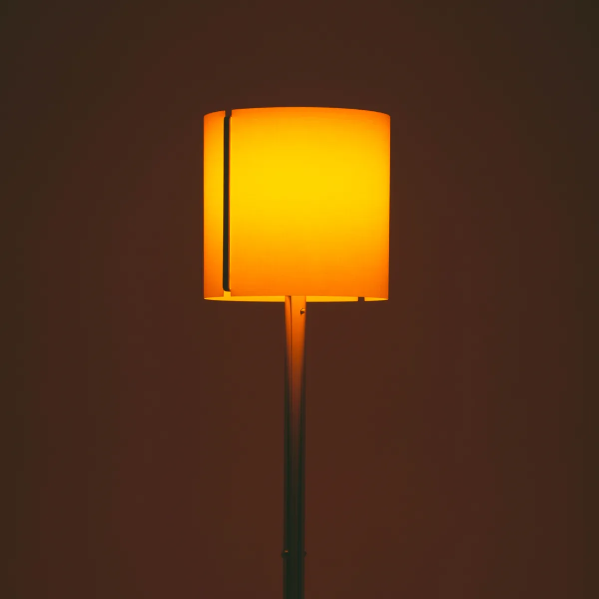 Farbiges Licht erzeugt die Stehlampe aufgrund eines farbig gefassten, leicht austauschbaren Glaszylinders in der Schirmmitte.