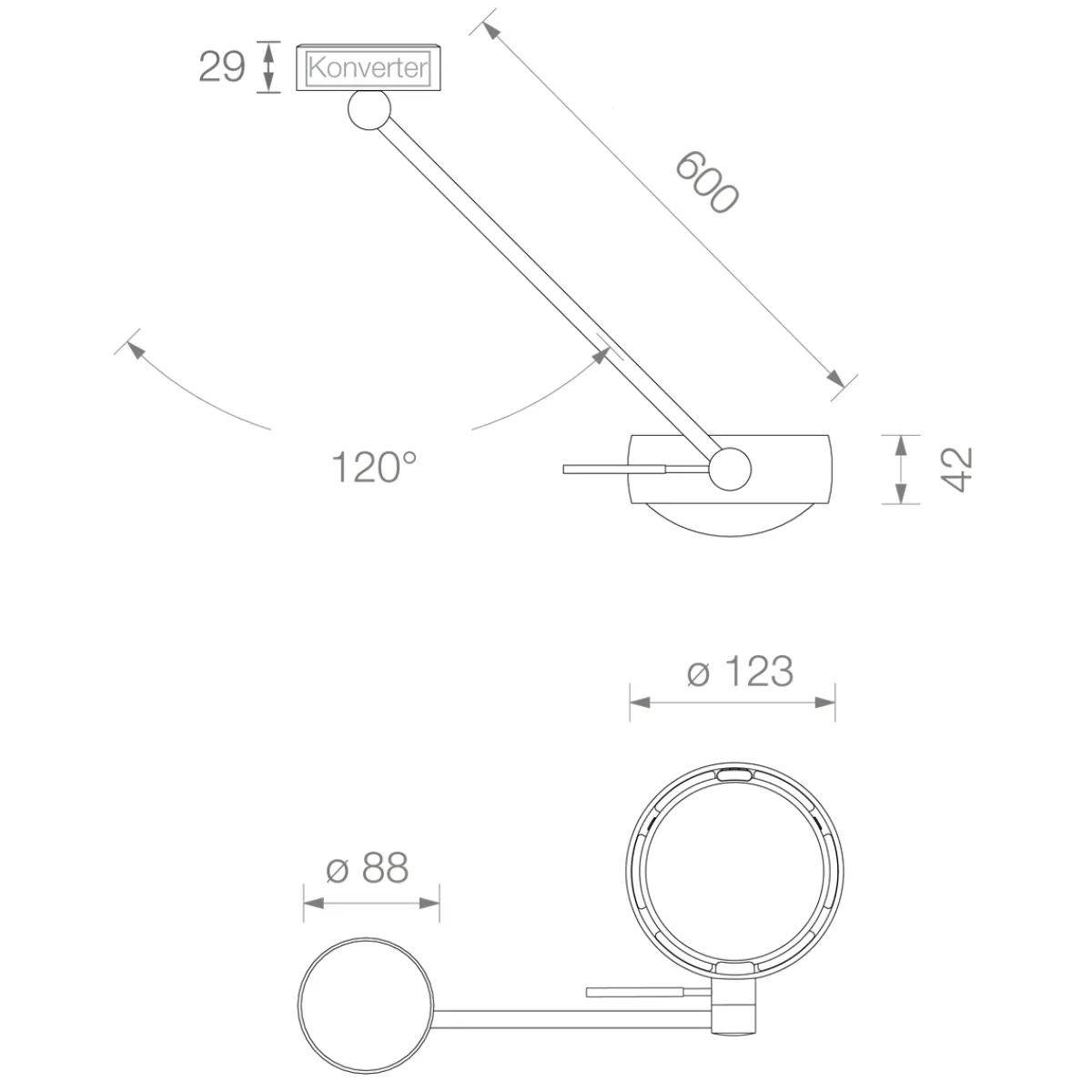 - Body um 180° drehbar und Arm um 120° schwenkbar