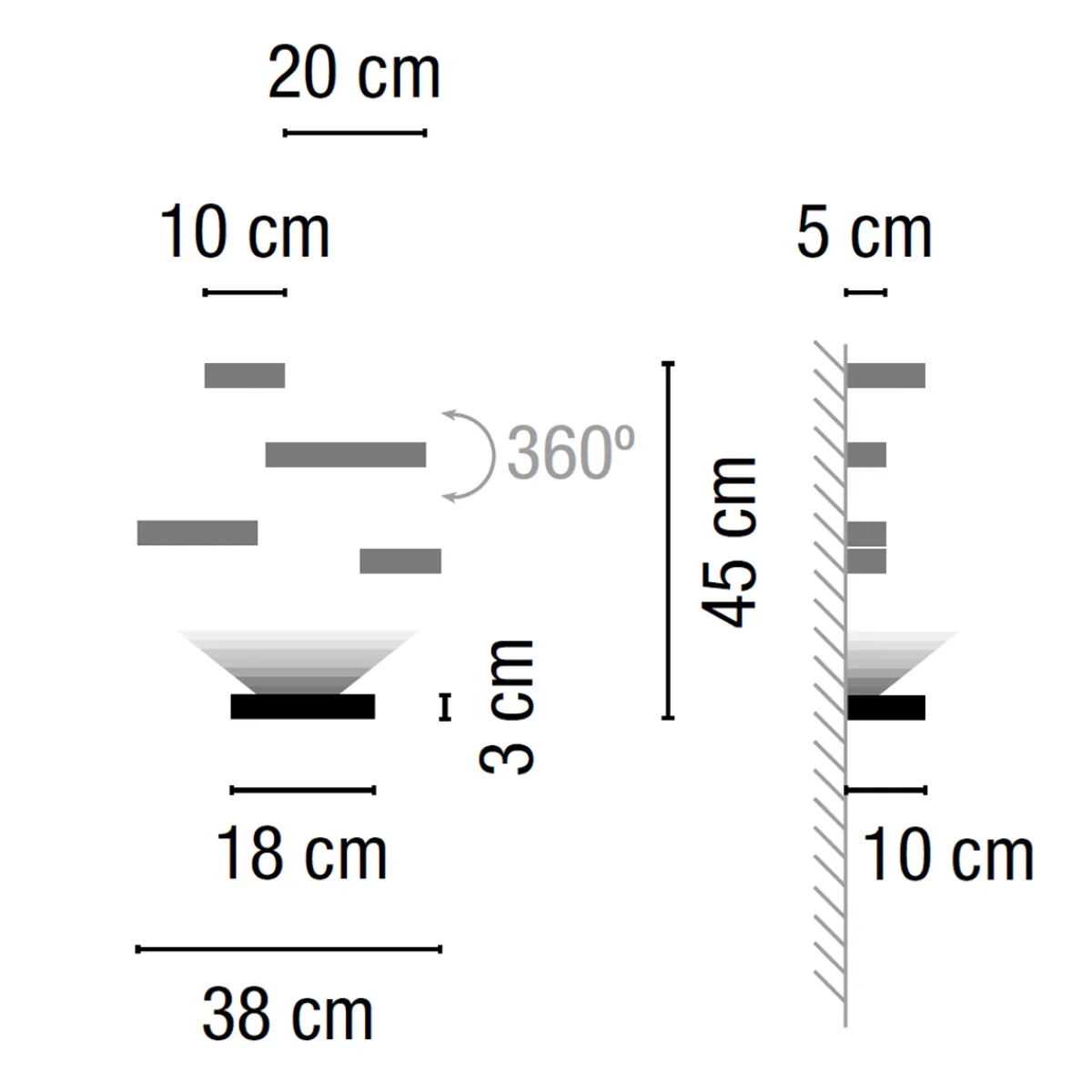 Die Lichtausstrahlung wird durch eine einzige LED im unteren Element der Set 7753 Wandleuchte erzeugt und von den oberen Einzelteilen an die Wandfläche reflektiert. Die oberen Modulen sind jeweils um 360° drehbar, wodurch sich individuelle Kompositionen kreieren und das Lichtbild nach Belieben verändern lassen. Dies macht die Vibia Set 7753 nicht nur zu einem originellen Lichtobjekt, sondern auch zu einem kreativen, kunstvollen Einrichtungsstück.