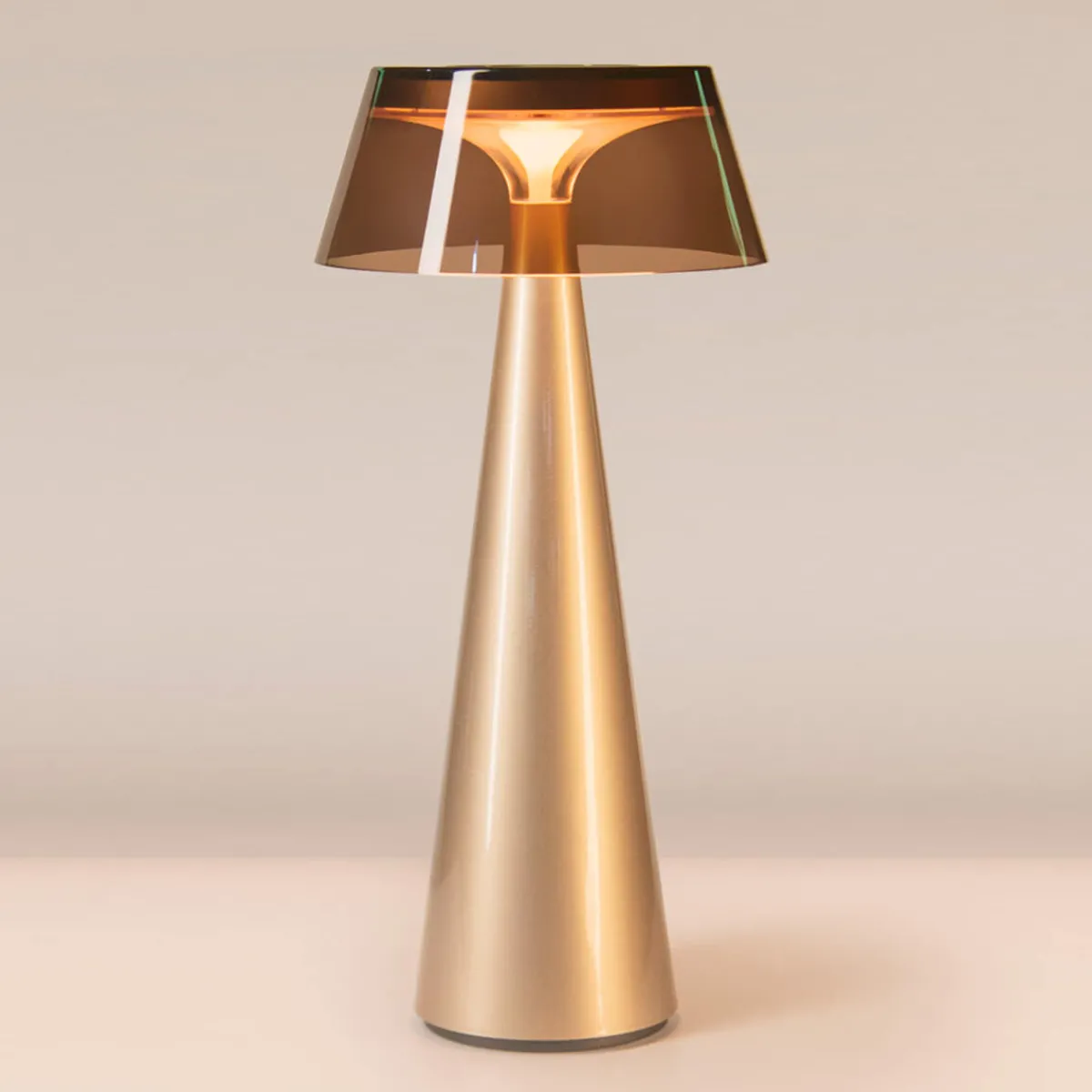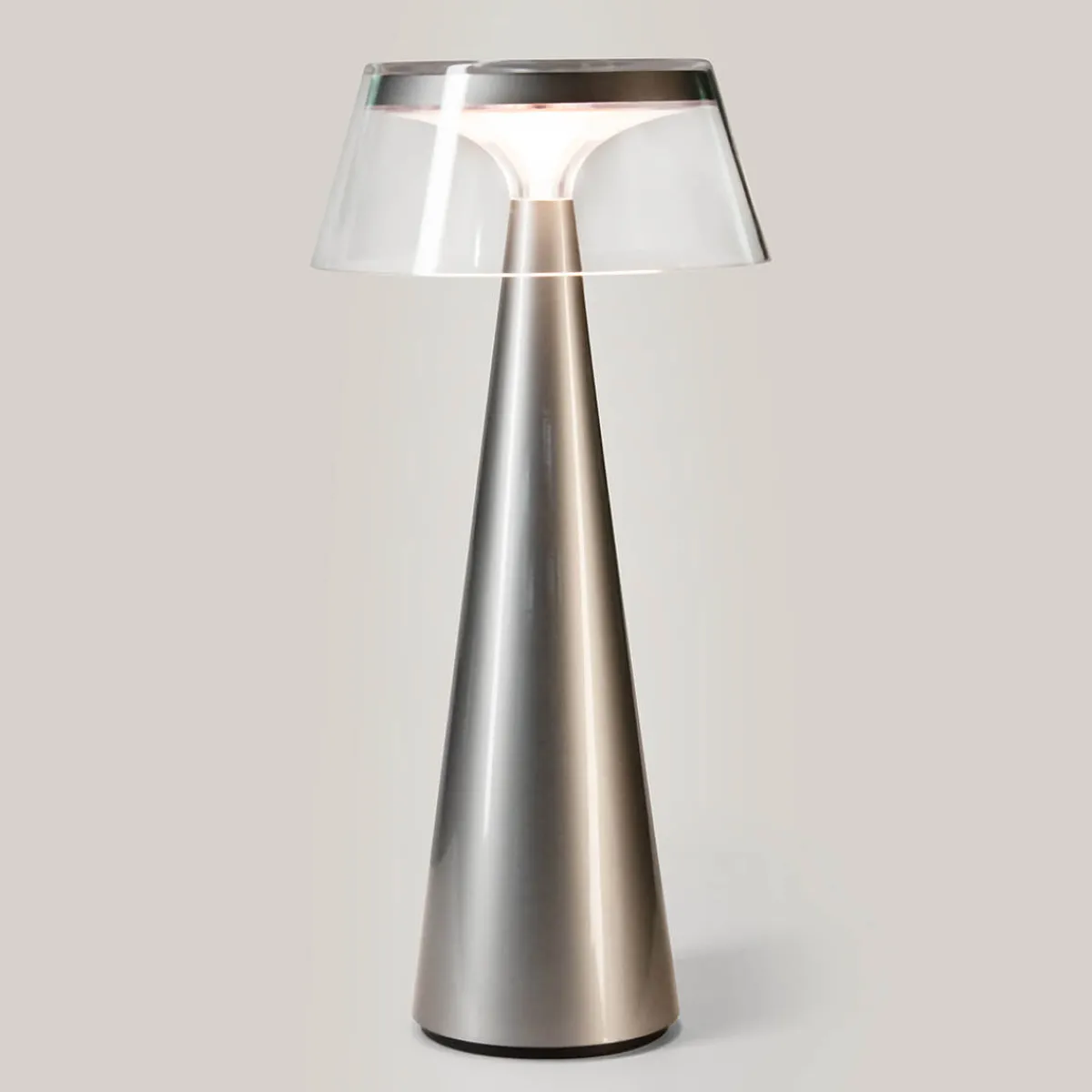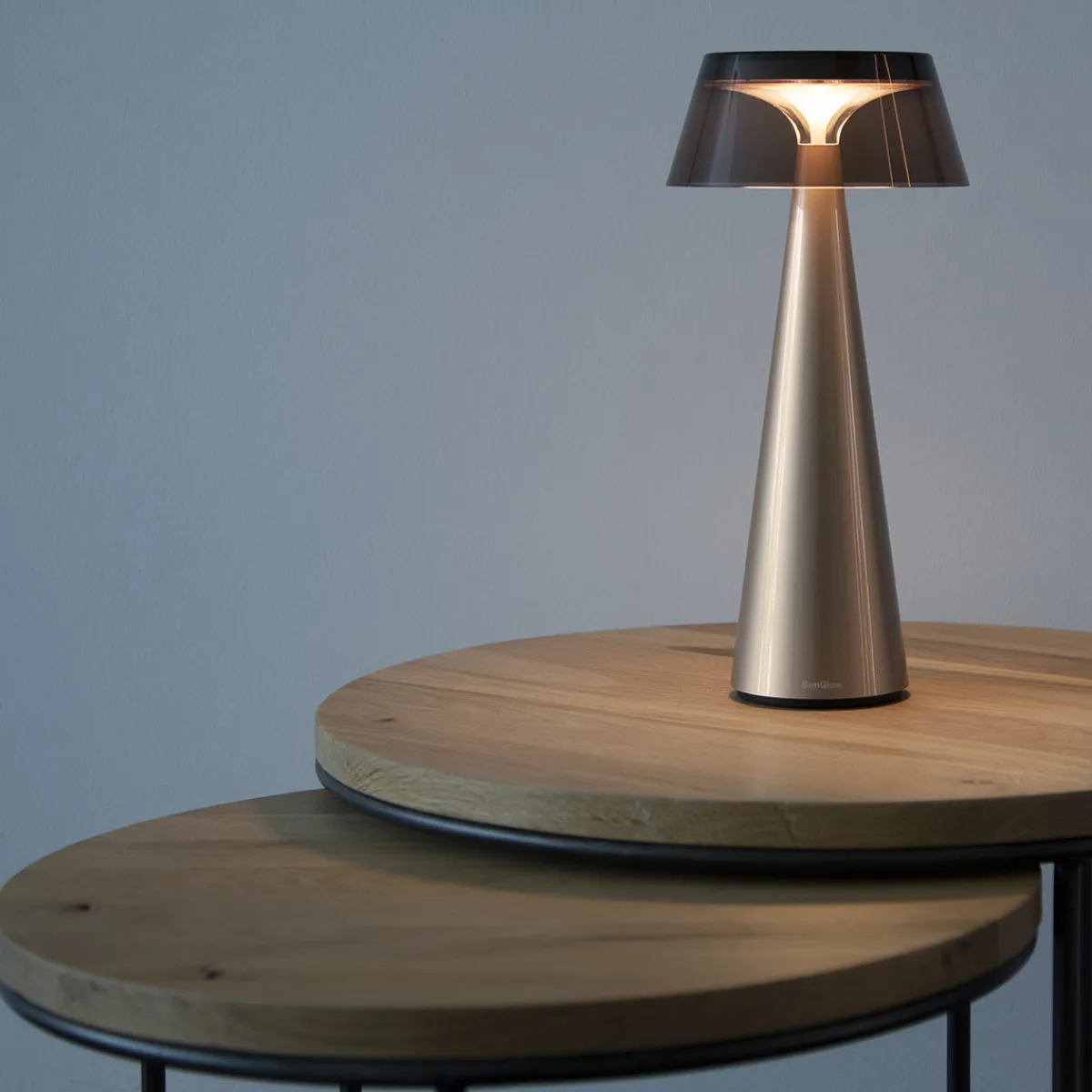 Ein weiteres Highlight ist der magnetische Leuchtenschirm. Während die champagnergoldene Akku-Tischlampe von einem Schirm in rauchig-grauer Tönung gekrönt wird, schmückt den silbergrauen Leuchtkörper ein transparenter Schirm – eine Kombination, die jedes Modell zum echten Blickfang macht. Natürlich steht es Ihnen frei, die SunGlow auch ohne Leuchtenschirm zu benutzen.