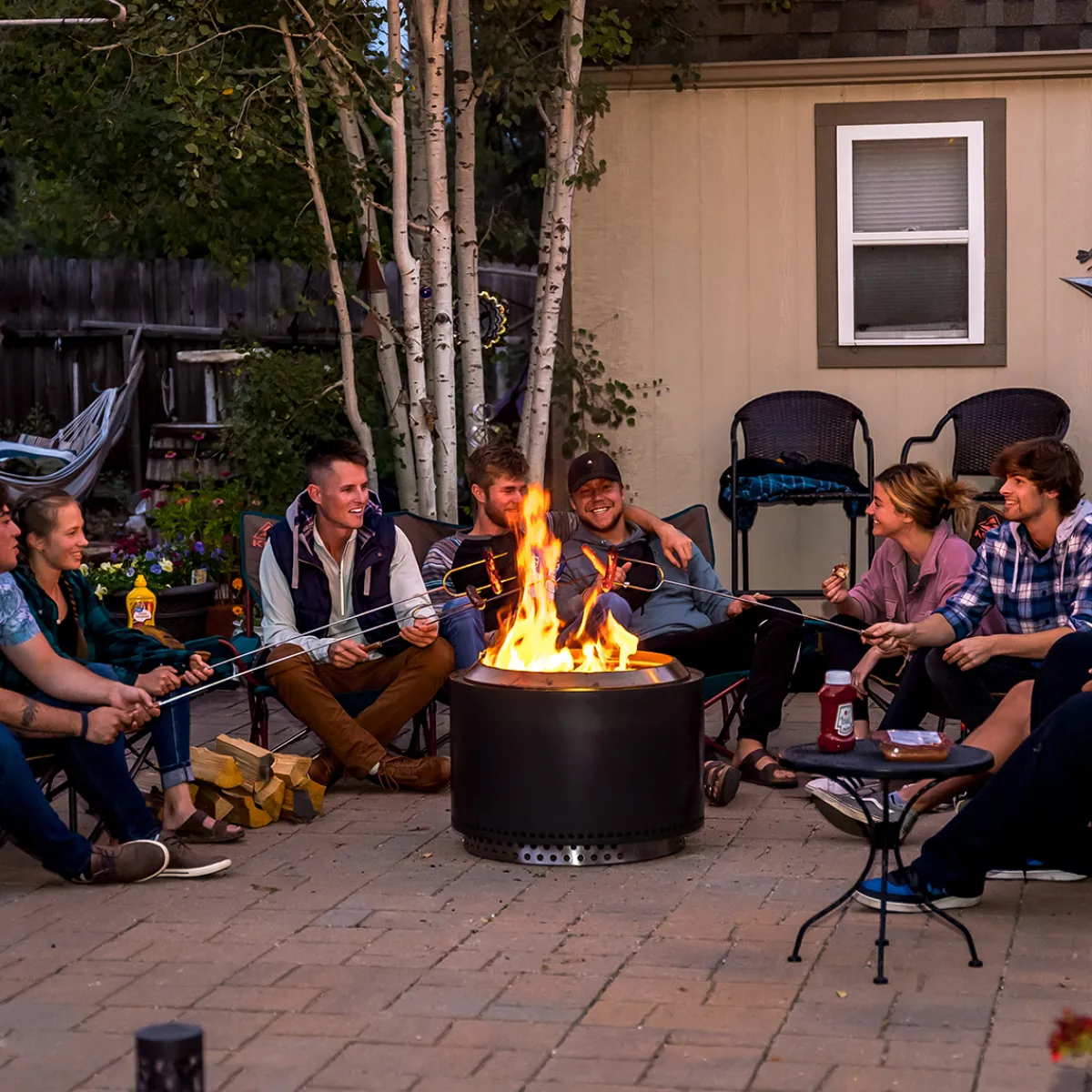 Im Mittelpunkt steht die Yukon 2.0 Feuerschale, die mit ihrer beeindruckenden Flammenhöhe von bis zu 1,5 Metern ideal für größere Gruppen und Outdoor-Events ist. Dank der innovativen 360°-Luftzirkulationstechnologie von Solo Stove verbrennt das Holz fast rauchfrei, sodass Sie die Wärme des Feuers ohne die Belästigung durch Qualm genießen können. Die entnehmbare Auffangschale erleichtert das Reinigen nach dem Gebrauch.