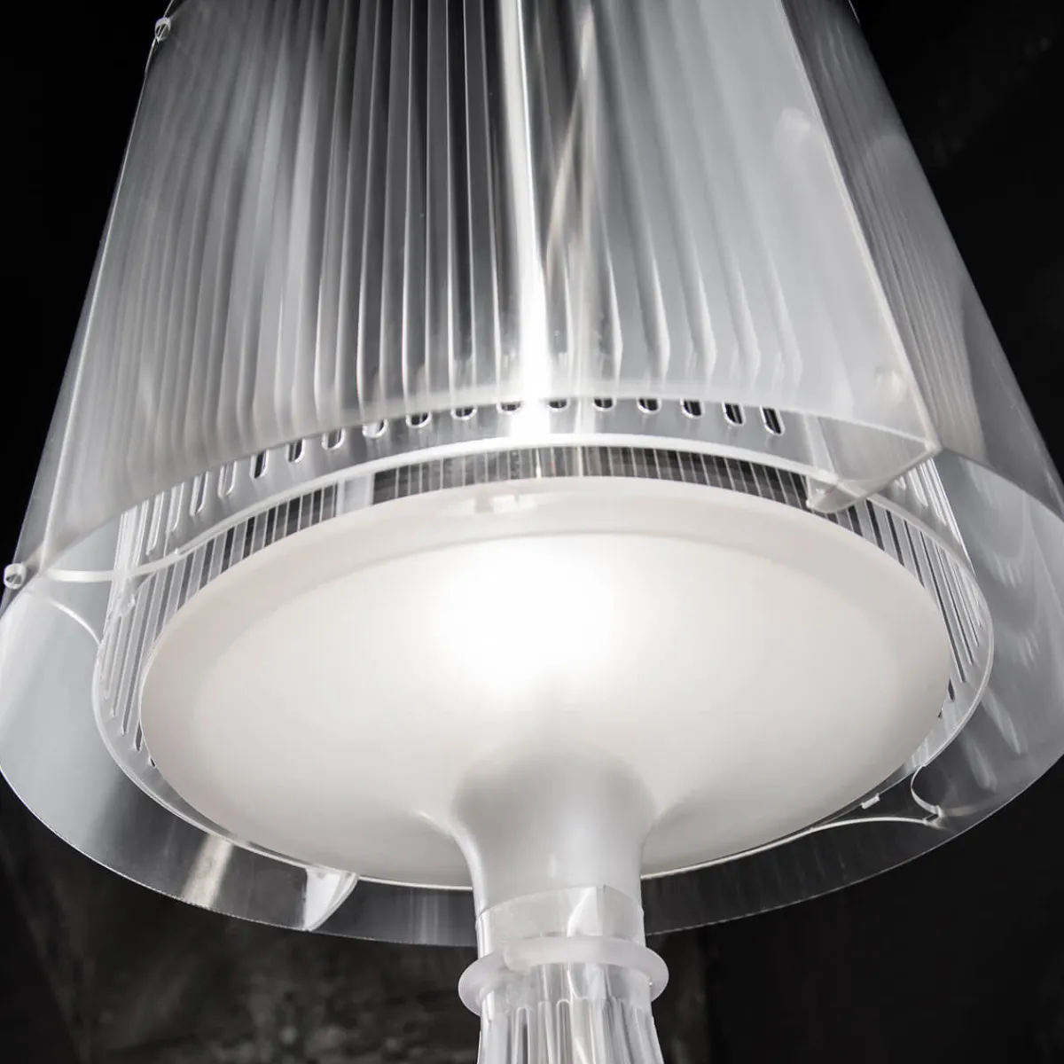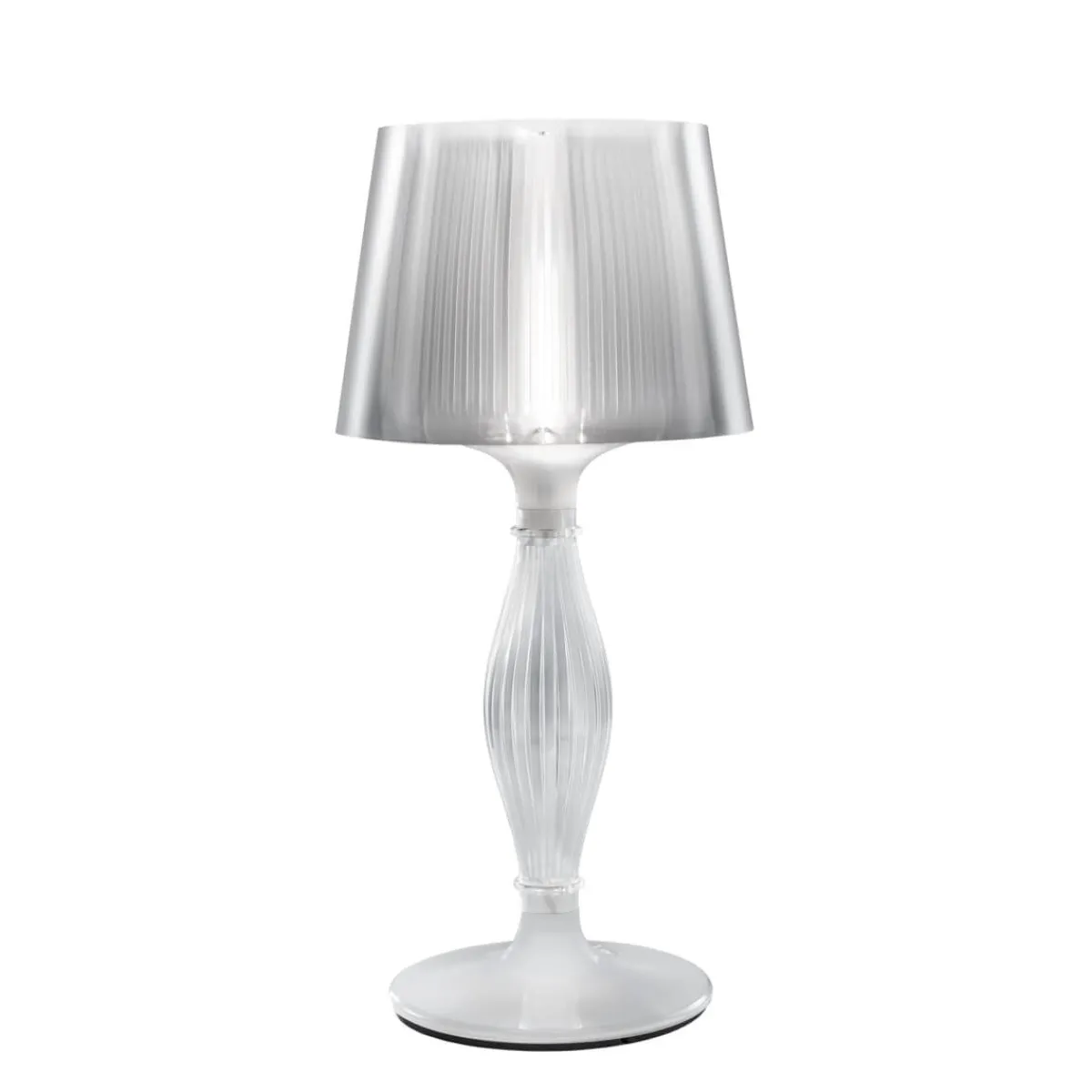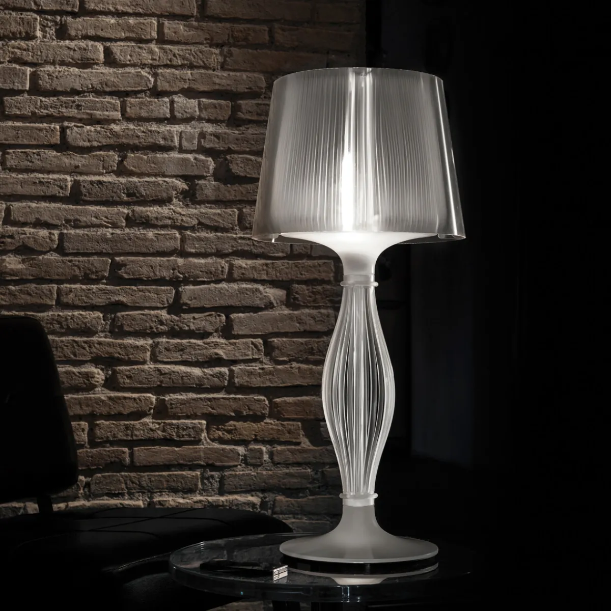 In der Slamp Liza Table, ein Erstlingswerk der italienischen Designerin Elisa Giovannoni, verbindet sich eine traditionelle Formensprache mit innovativen Werkstoffen. Mit ihrer an- und abschwellenden Silhouette rekurriert die Tischlampe auf das Formenspiel barocker Lichtquellen. Der zylinderförmige Diffusor wiederum zeigt sich von den klassischen Schirmen aus Kristall inspiriert.