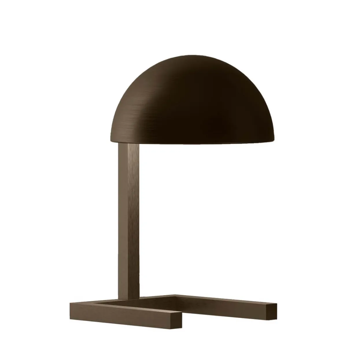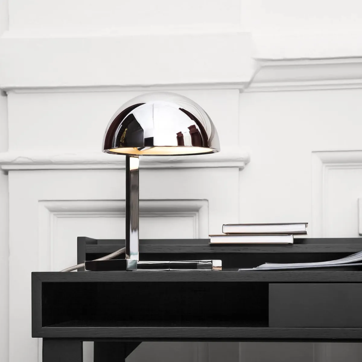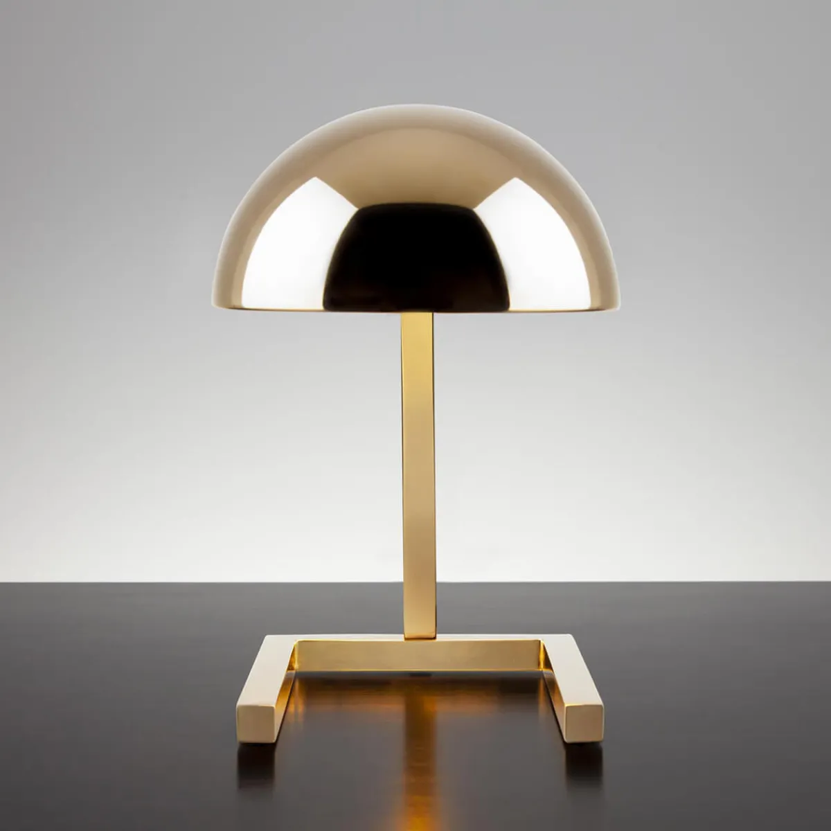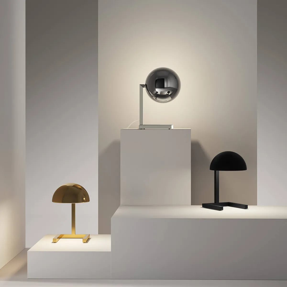 Die Tischlampe besteht aus Messing und verfügt über einen sphärischen Metallschirm, der auf einem viereckigen Sockel ruht. Der um 90° verstellbare Schirm erlaubt eine flexible Lichtausrichtung – ideal zur punktuellen Beleuchtung der Arbeitsfläche, zur stimmungsvollen Akzentuierung im Wohnbereich oder zum seitlichen Aufhellen einer Wandnische.