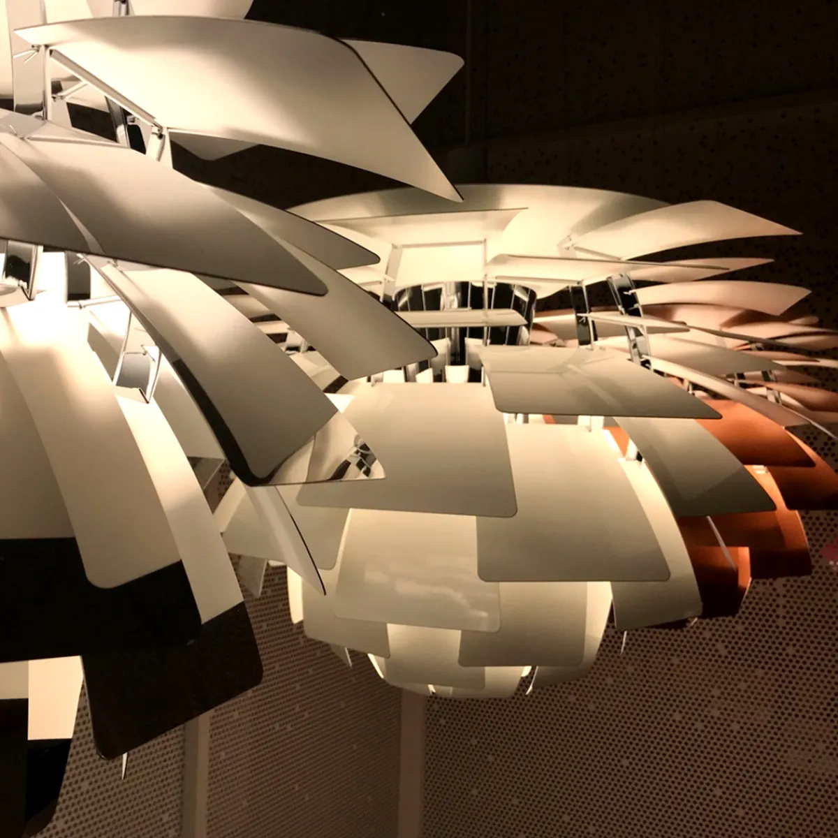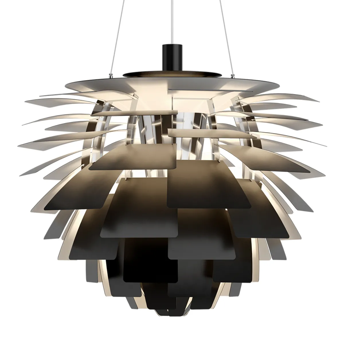 - Ausdrucksstarke Pendelleuchte mit 72 Blättern aus Messing, Kupfer, Edelstahl oder lackiertem bzw. pulverbeschichtetem Stahl