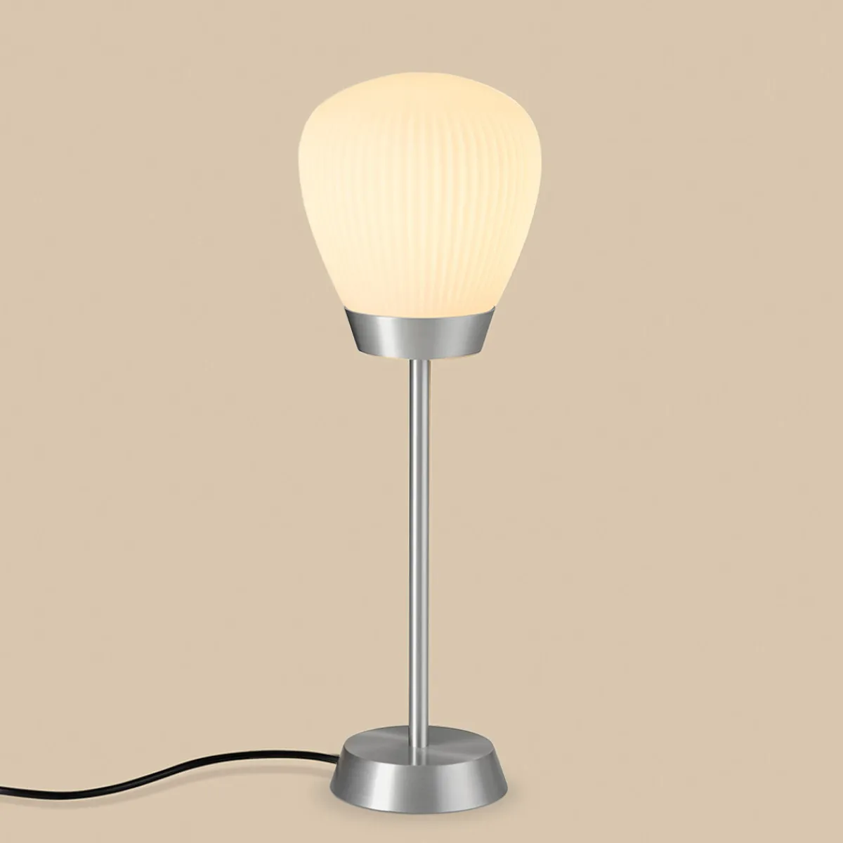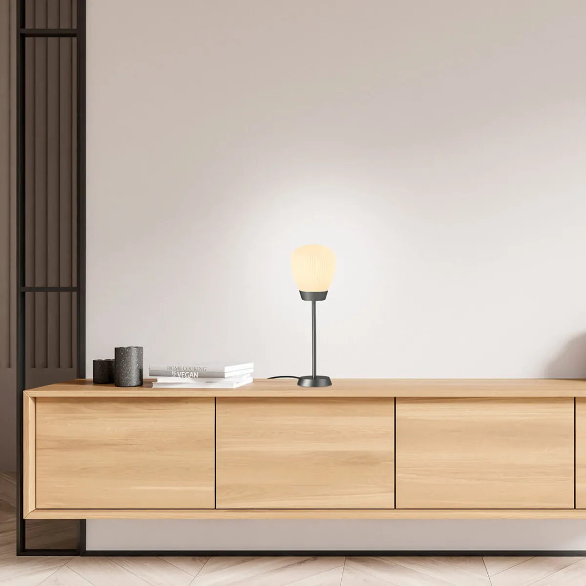 Die Plissee T1 Tischleuchte von Holtkötter verbindet anspruchsvolles Design mit hochwertiger Lichttechnik und setzt stilvolle Akzente in Ihrem Wohnraum. Der plissierte Schirm aus mundgeblasenem Opalglas sorgt für eine gleichmäßige, blendfreie und schafft eine warme, einladende Atmosphäre.