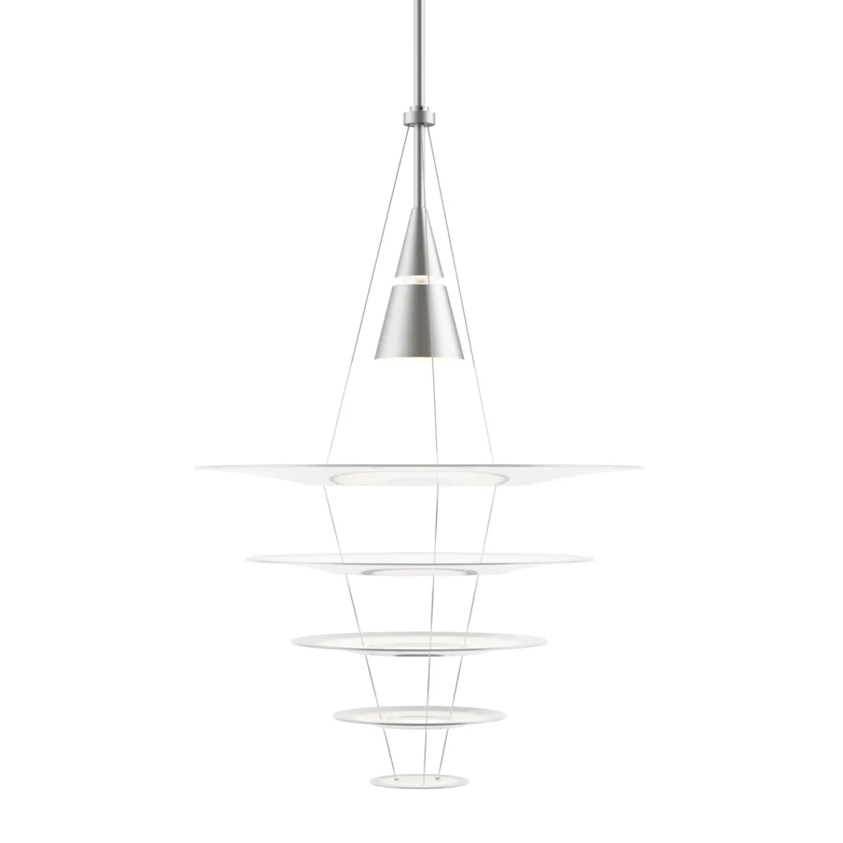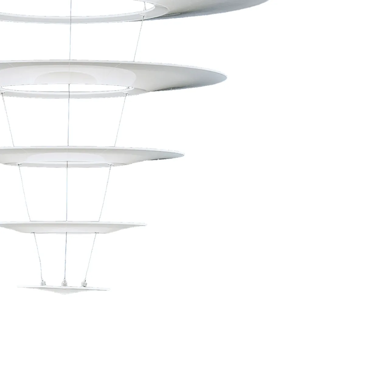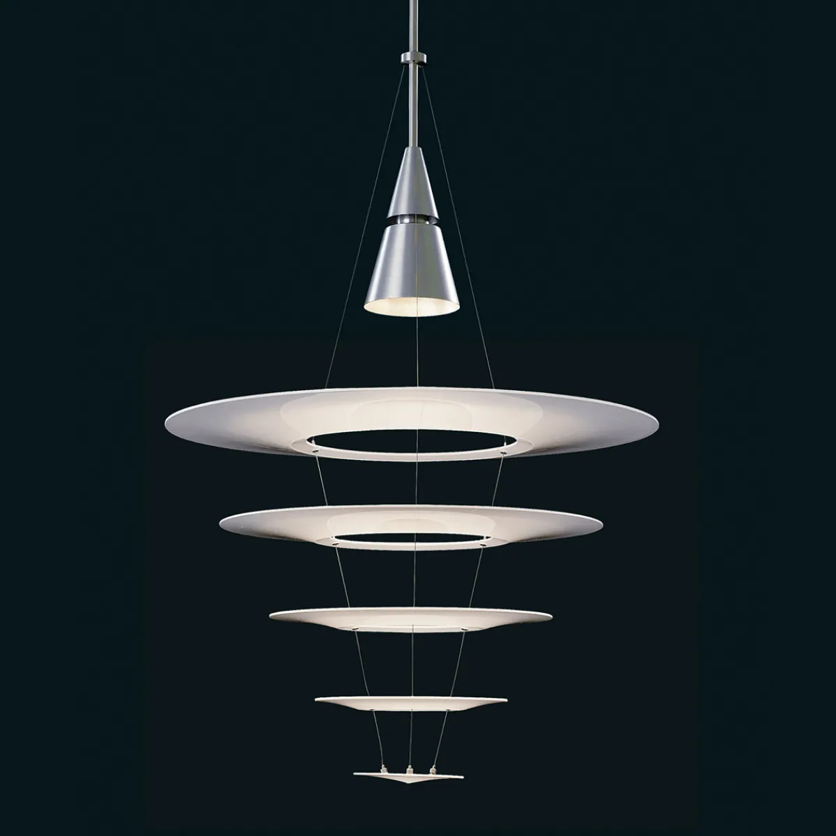 Die Enigma 545 Pendelleuchte, eine Produktkreation des japanischen Designers Shoichi Uchiyama, überrascht durch ihre ungewöhnliche Leichtigkeit und Transparenz. Ausgelöst wird dieser Eindruck durch die übereinander angeordneten Leuchtenschirme, die scheinbar schwerelos und frei unter der Lichtquelle schweben. Dass die aus Acryl gefertigten Schirmsegmente an zarten Edelstahlseilen befestigt sind, erkennt der Betrachter erst auf den zweiten Blick.