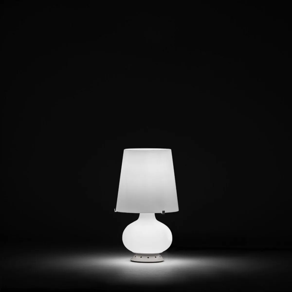 Leuchtenschirm und Lampenglocke sind mit Leuchtmitteln ausgestattet und können separat voneinander an- und ausgeschaltet werden. Das durch die Fontana Arte Fontana Piccola Tischleuchte erzeugte Licht ist diffus, sanft und nach unten wie auch oben hin gestreut.