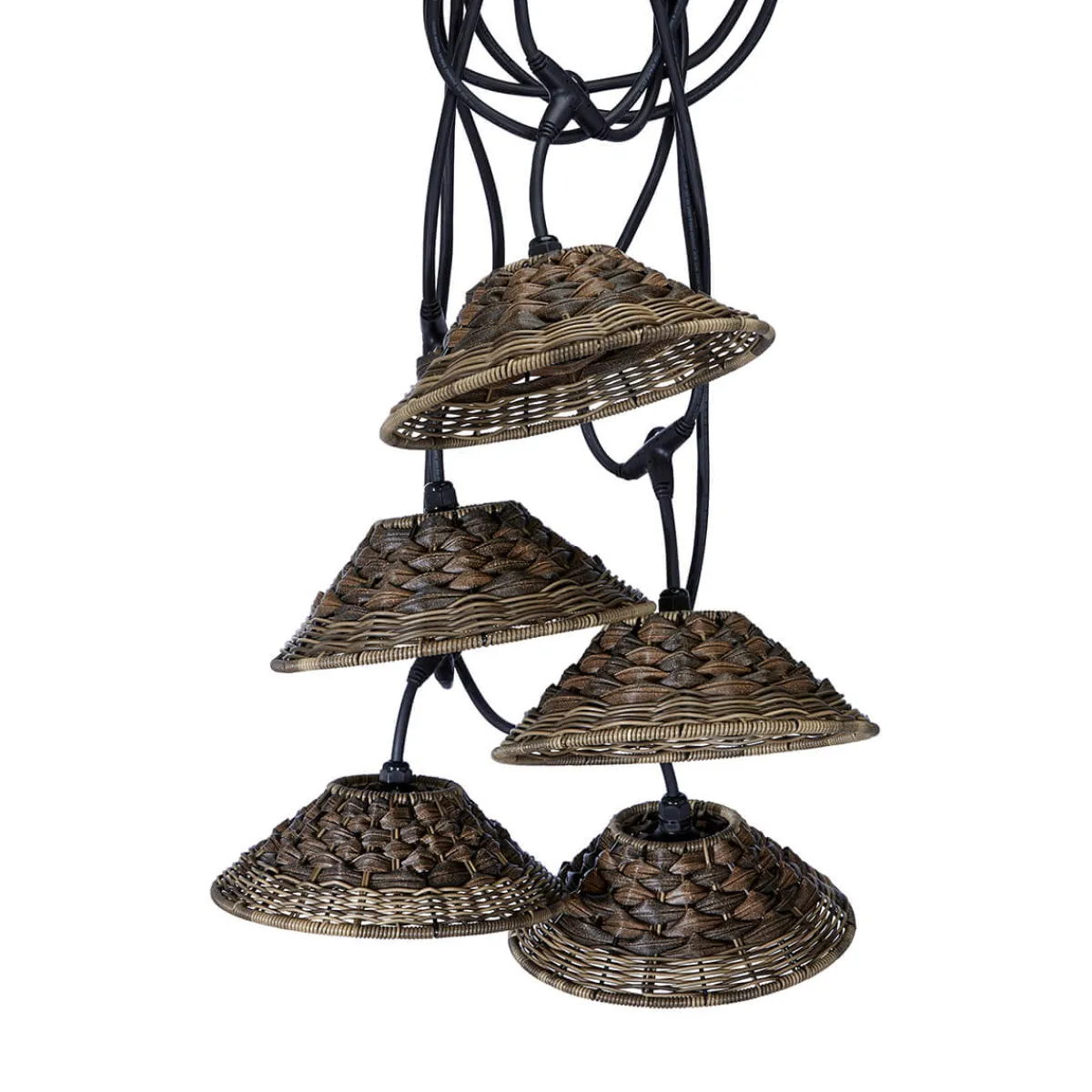 Die Lampenschirme der Außenleuchte zeichnen sich durch eine natürliche Korbgeflecht-Optik aus, bei der künstlich hergestellte Materialien wie Rattan und Wasserhyazinthe gemischt wurden, um einen traditionellen, rustikalen Look zu schaffen. Jeder Schirm hat einen Durchmesser von 27 cm und eine Höhe von 9 cm, was die zu einem auffälligen Element in jedem Außenbereich macht.