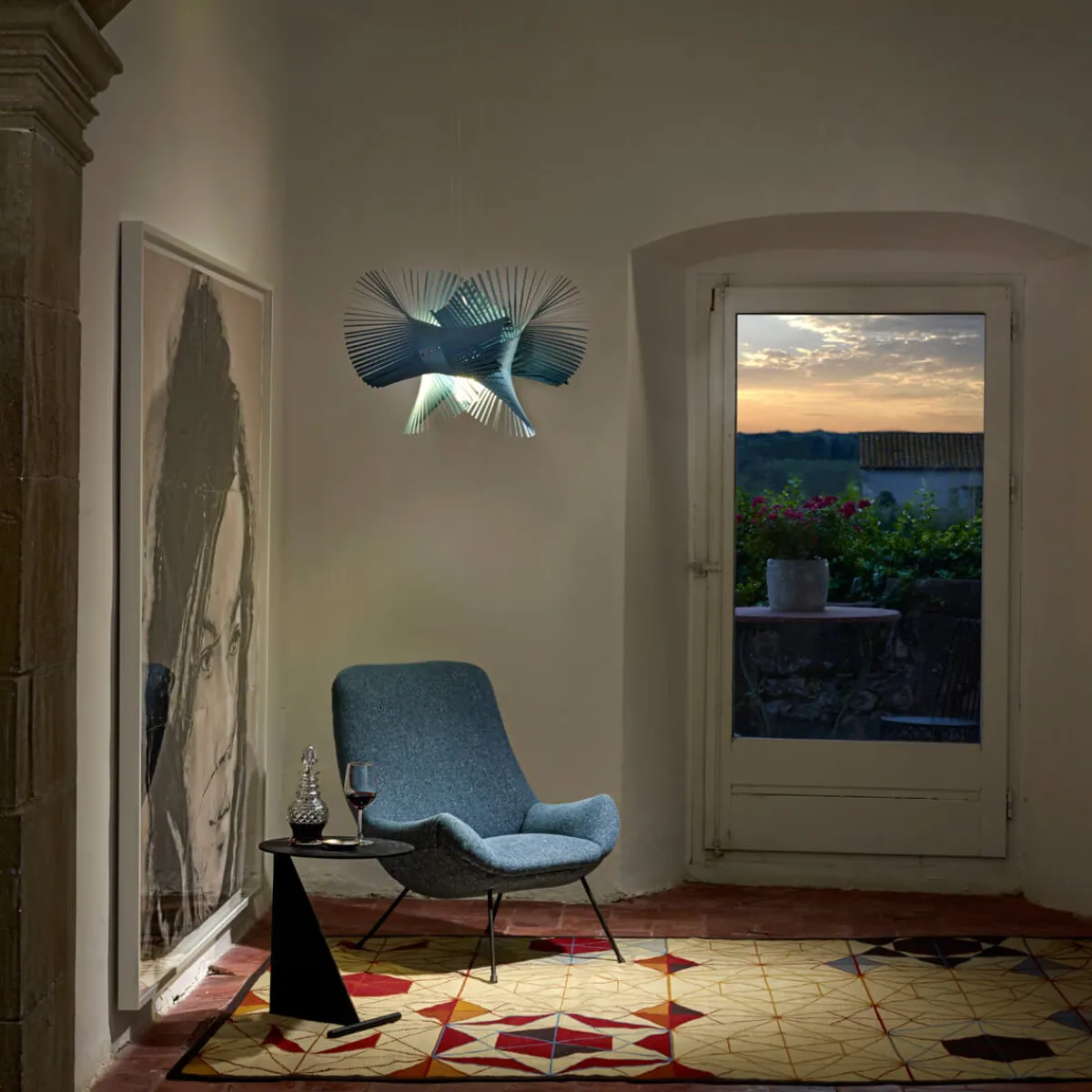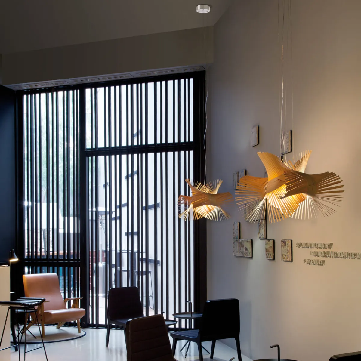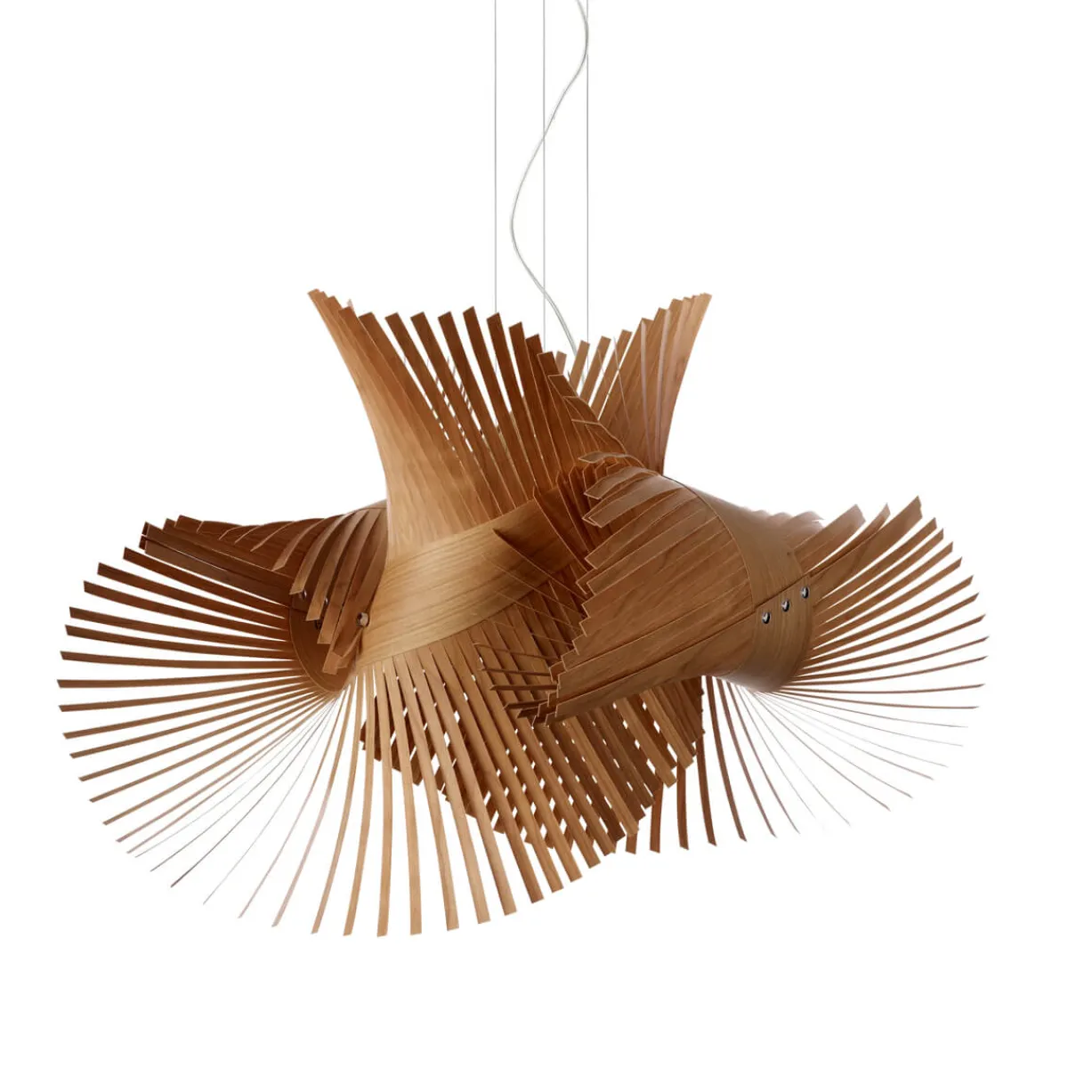 Manchmal reicht ein einziger Blick, um zu spüren: Diese ist anders. Die MiniMikado von LZF Lamps, entworfen von Miguel Herranz, ist eine Hommage an das kreative Chaos – ein leuchtendes Kunstwerk aus Echtholzfurnier, das spielerisch an das berühmte Mikado-Stäbchenspiel erinnert. Ihre in alle Richtungen ausgebreiteten Holzstreifen formen sich zu einer luftigen Skulptur, die gleichermaßen ungezähmt wie harmonisch wirkt – wie das Gefieder eines exotischen Vogels, das sich im Flug entfaltet.