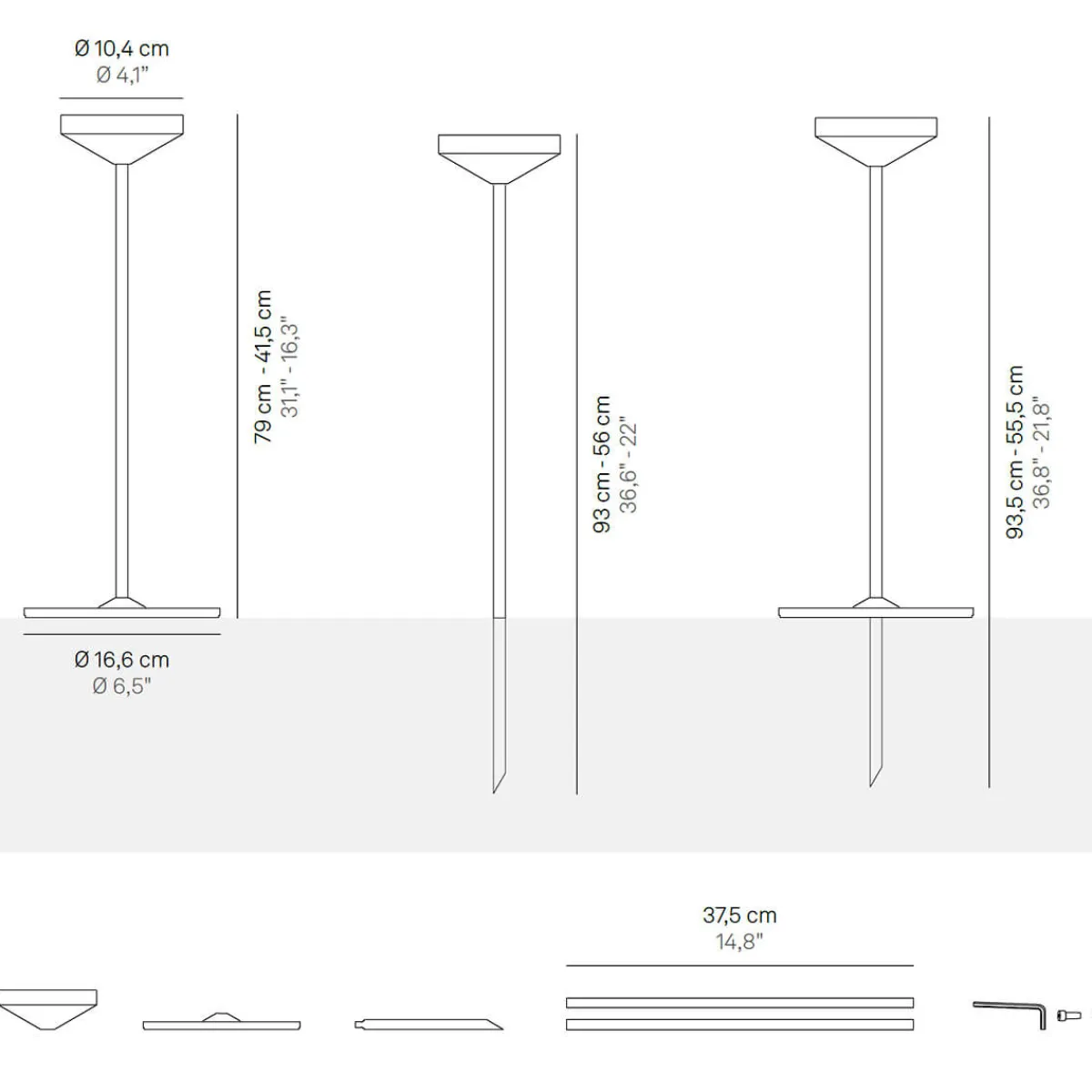 Der praktische Zafferano Pina Ständer hebt die Pina Akkuleuchte auf ein neues Niveau. Die Stehlösung umfasst zwei Stäbe à 37,5 cm Länge, einen kreisrunden Sockel, einen Erdspieß, die runde Ablagefläche für die und ein Montagekit.