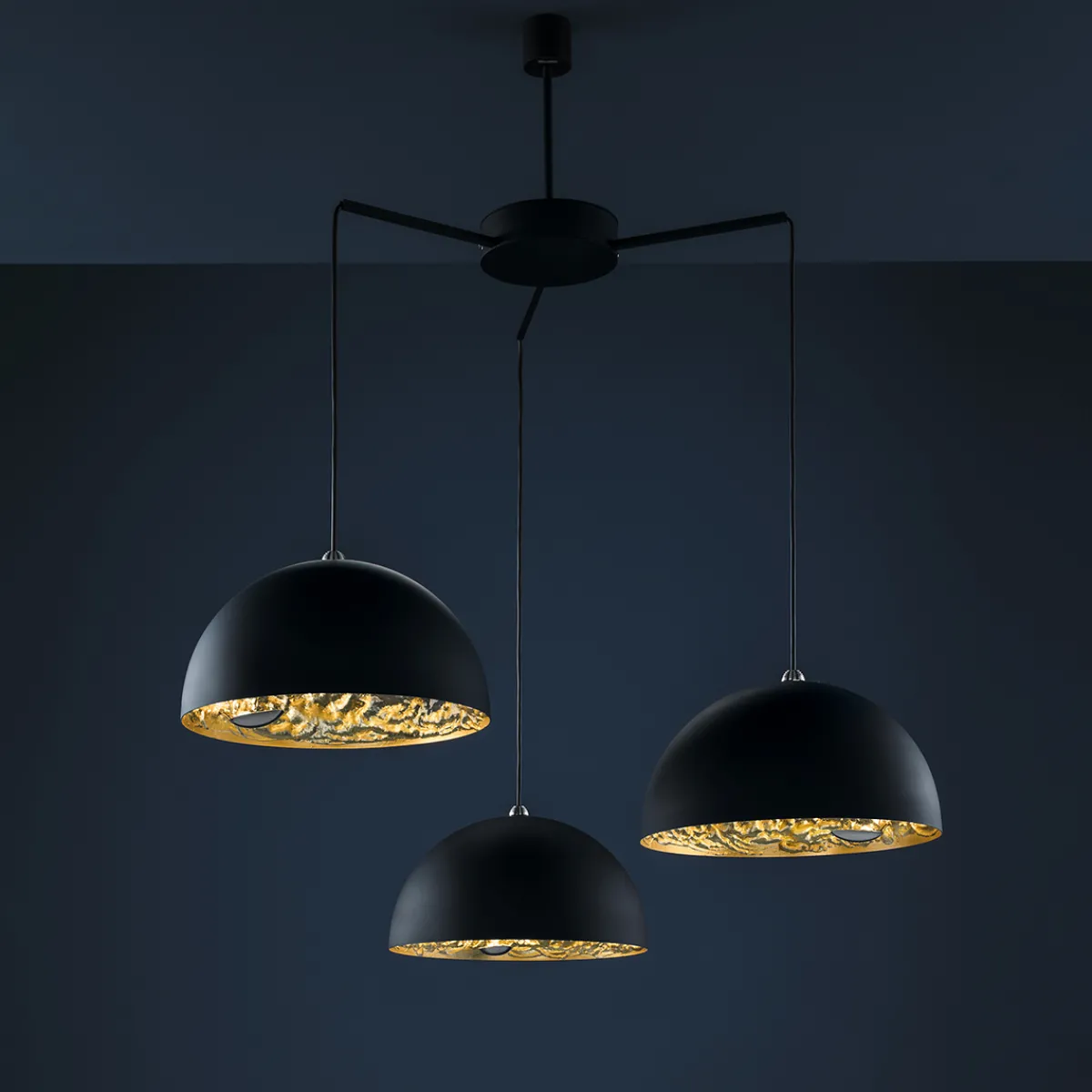 | Material/Oberfläche: | Aluminium mit Blattgold / Blattsilber / Blattkupfer, außen mattschwarz, Leuchtmittelhalterung: Stahllöffel, Baldachin: schwarz |